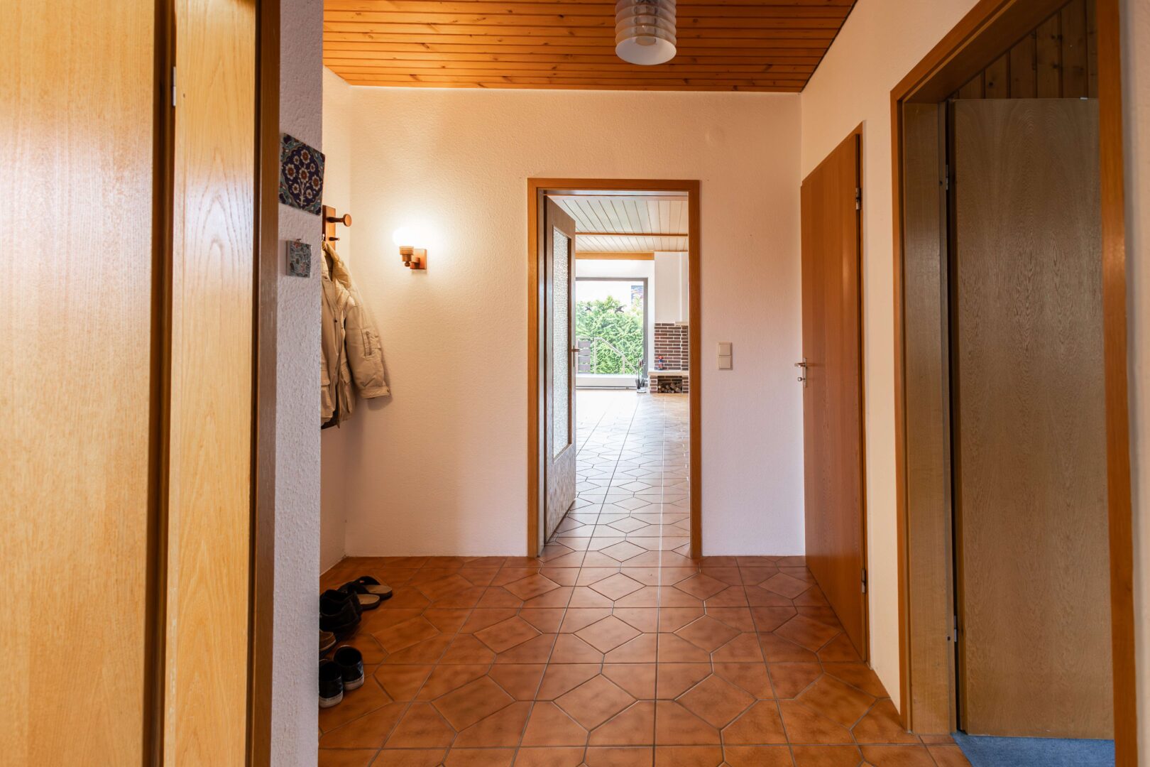 Das Erdgeschoss umfasst drei praktisch geschnittene Schlafzimmer, ein großzügiges, lichtdurchflutetes Wohnzimmer mit direktem Zugang zur Terrasse sowie eine separate Küche. Zwei Tageslichtbäder – eines mit Badewanne, eines mit Dusche – sorgen für zusätzlichen Komfort und Flexibilität im Alltag.