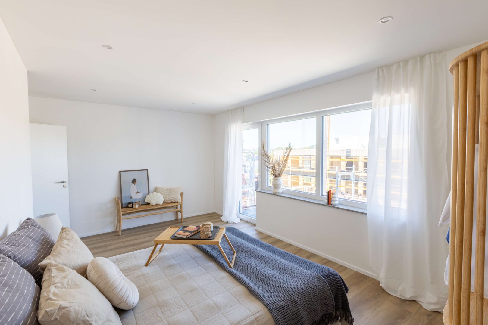 Über den zentralen Flur erreicht man zwei geräumige Schlafzimmer, den offenen Wohn- und Essbereich mit integrierter Küche sowie das großzügige Tageslichtbad. Dieses ist ausgestattet mit Doppelwaschbecken, Badewanne und bodentiefer Dusche. Vom Wohnbereich aus gelangt man direkt auf die 176 m² große Dachterrasse, die viel Platz zum Entspannen im Freien sowie für gemeinsame Stunden mit Familie und Freunden bietet.