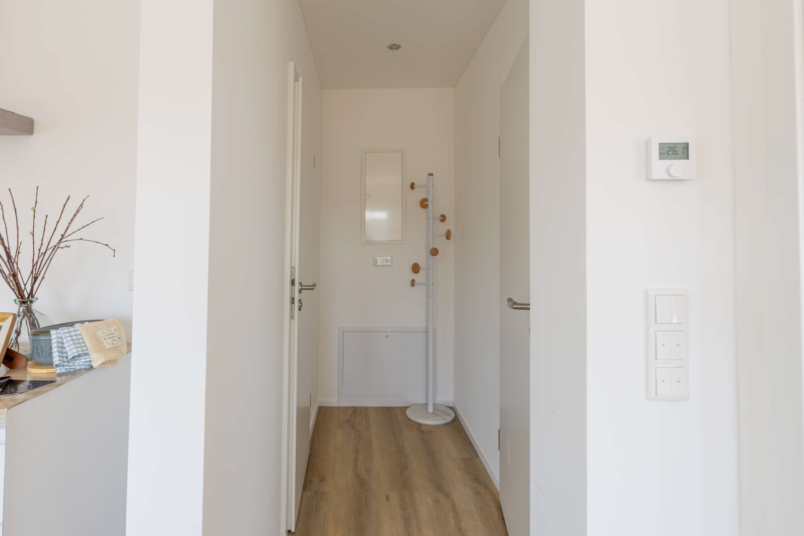 Über den zentralen Flur erreicht man den offenen Wohn- und Essbereich mit integrierter Küche sowie das Badezimmer. Dieses ist ausgestattet mit einem Waschbecken, WC und einer bodentiefer Dusche. Vom Wohnbereich aus gelangt man durch eine Tür in das angrenzende Schlafzimmer.